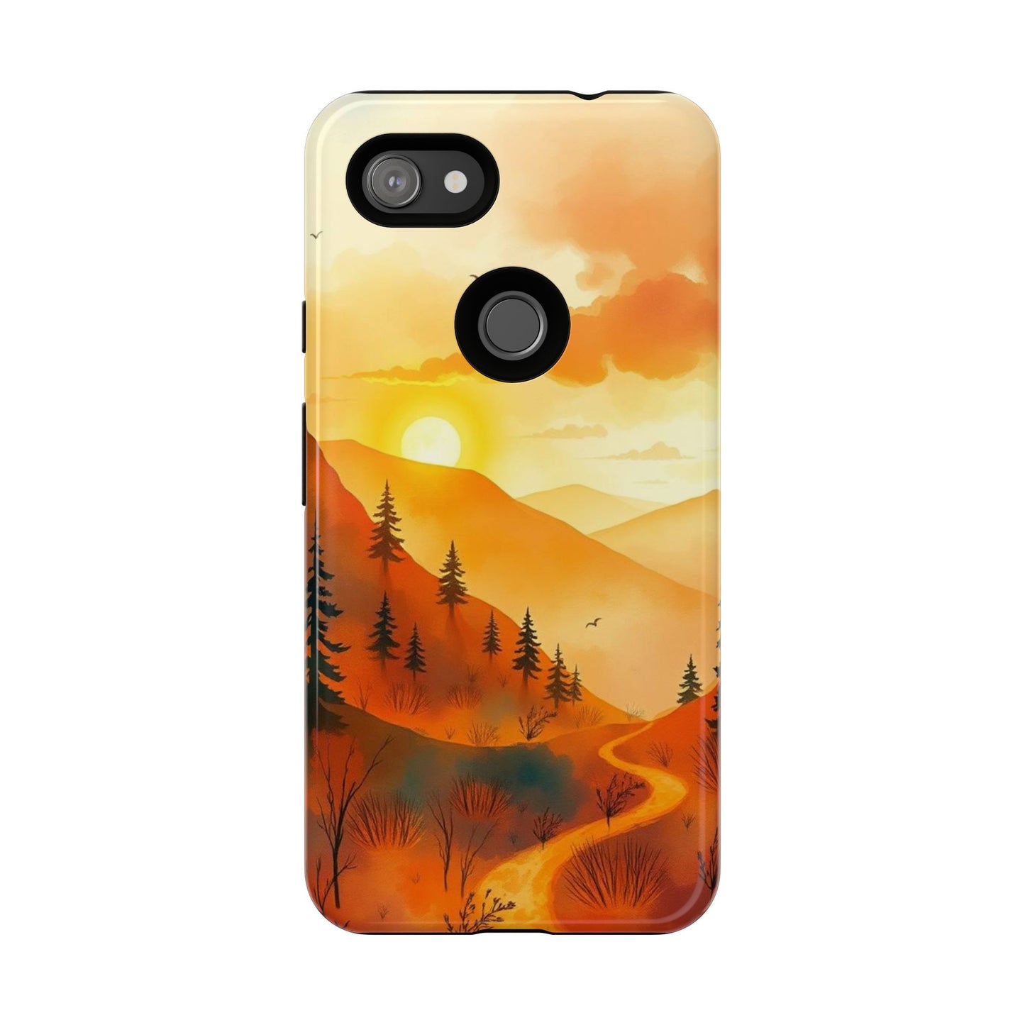 Immerse yourself in the peaceful beauty of a golden sunset casting warm light behind roaming hills. A winding dirt path weaves gently through the landscape, inviting you to journey into tranquility. Rendered in rich watercolour tones of deep oranges and glowing yellows, this hard case combines artistic elegance with durable protection. Perfect for those who love nature’s calming hues, it transforms your phone into a vibrant escape, blending everyday practicality with stunning, serene scenery.