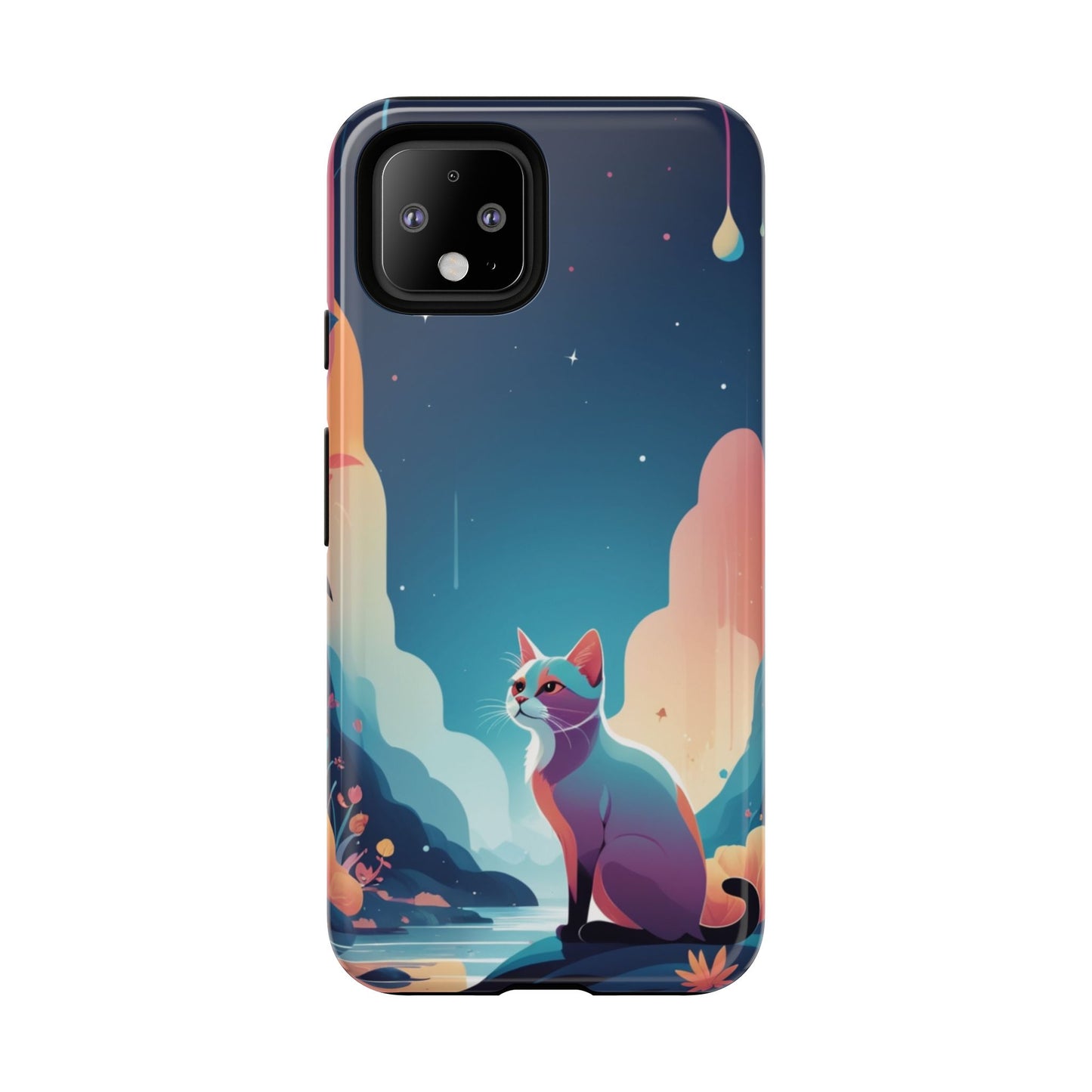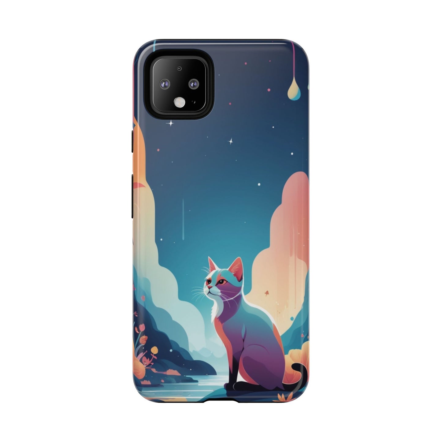 This mobile phone case design features a pensive white cat by a shimmering stream, set against a sci-fi skyline of deep blues and vivid oranges. Bold colours and sturdy build make it as striking as it is protective.