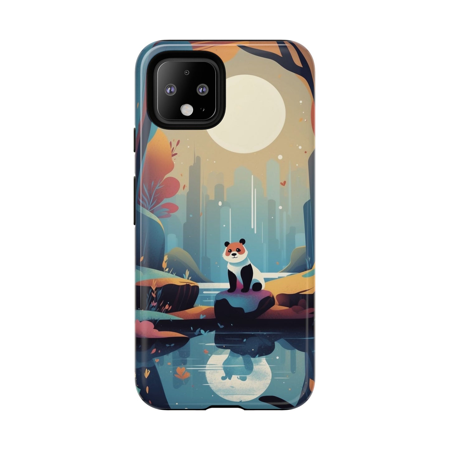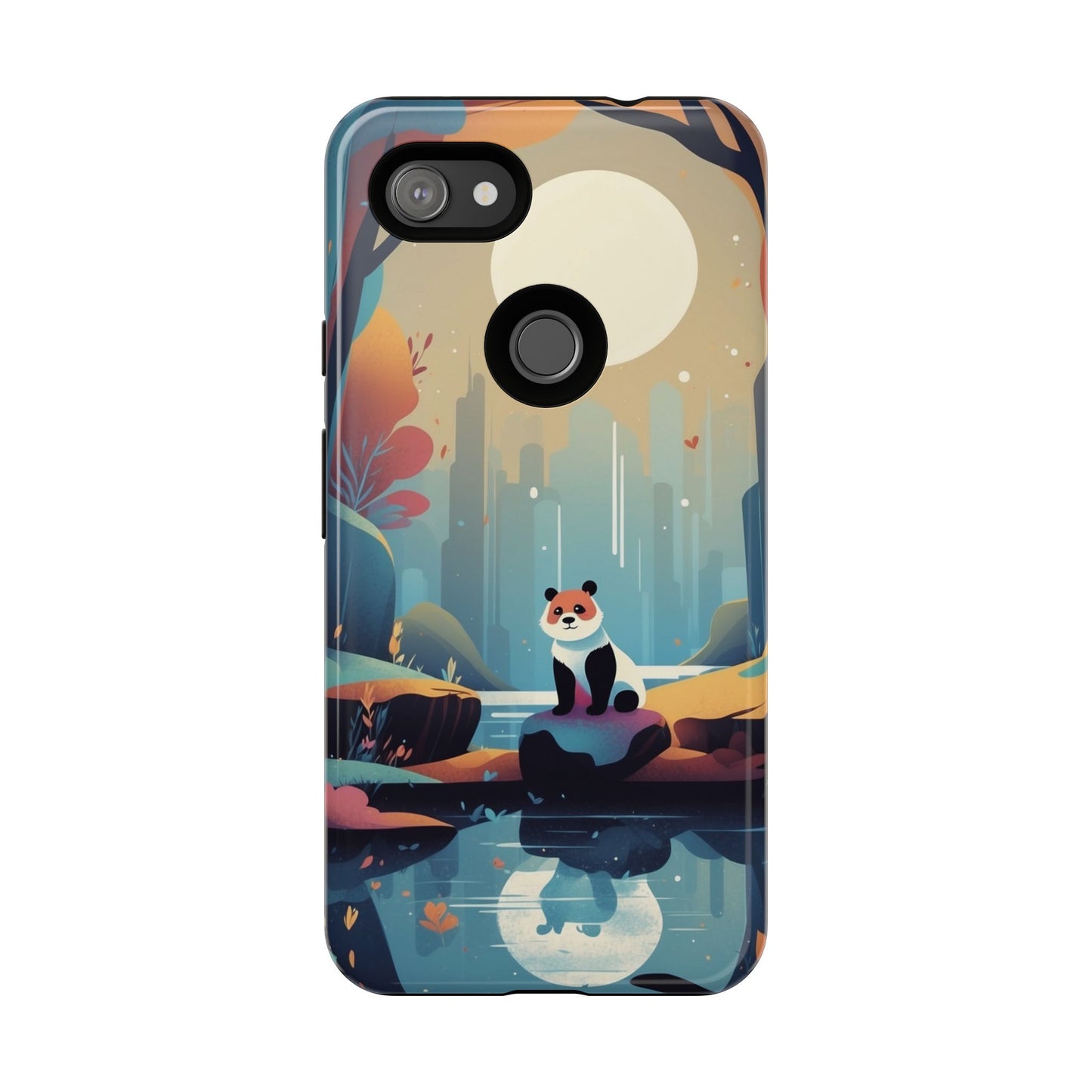This mobile phone case design captures a serene scene of a panda sitting peacefully on a rock, gazing over still water beneath a glowing full moon. The moon’s light shimmers in the gentle reflection, creating a calming, dreamlike atmosphere. Rendered in bold, striking colours, the design blends tranquillity with visual impact. More than just protection for your device, it’s a pocket-sized piece of art — perfect for anyone who loves nature, nightscapes, and a touch of quiet magic in their lives.