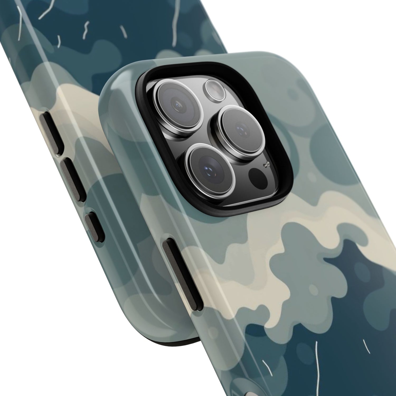 A small fox perches atop a dark hill, surrounded by swirling grey and blue storm clouds in a sleek, flat two-dimensional design. The contrast between the fox’s warm tones and the moody backdrop creates a quiet, contemplative scene full of charm and subtle drama. Perfect for those who appreciate minimalist art with a touch of nature’s mystery — this case turns your phone into a stylish statement of calm amidst the storm. Perfect for those who want a phone case full of warmth, whimsy, and a sprinkle of affection — a fun way to show off your playful side with every call and text.