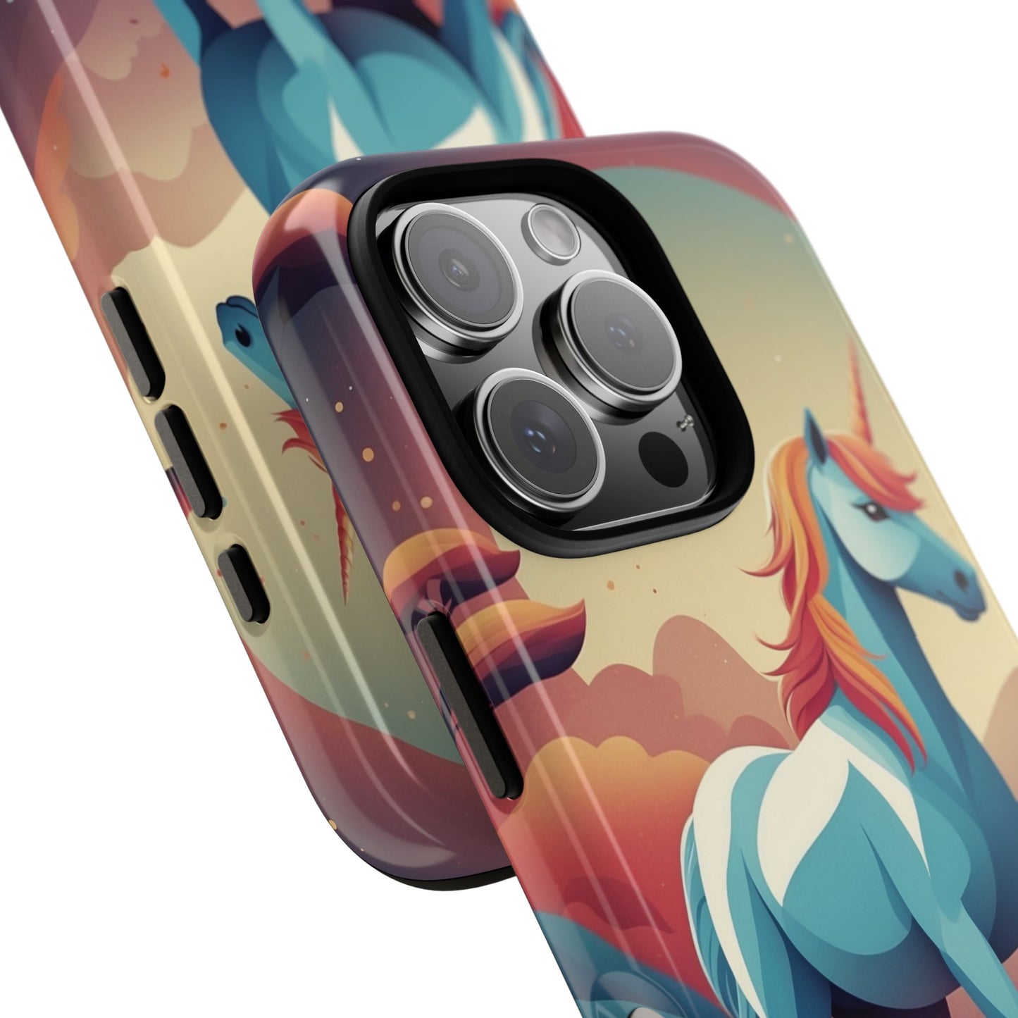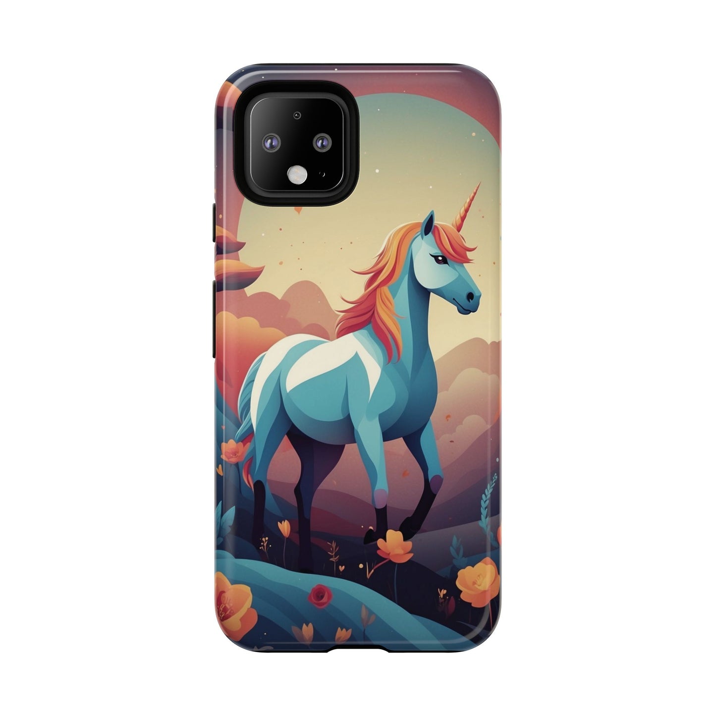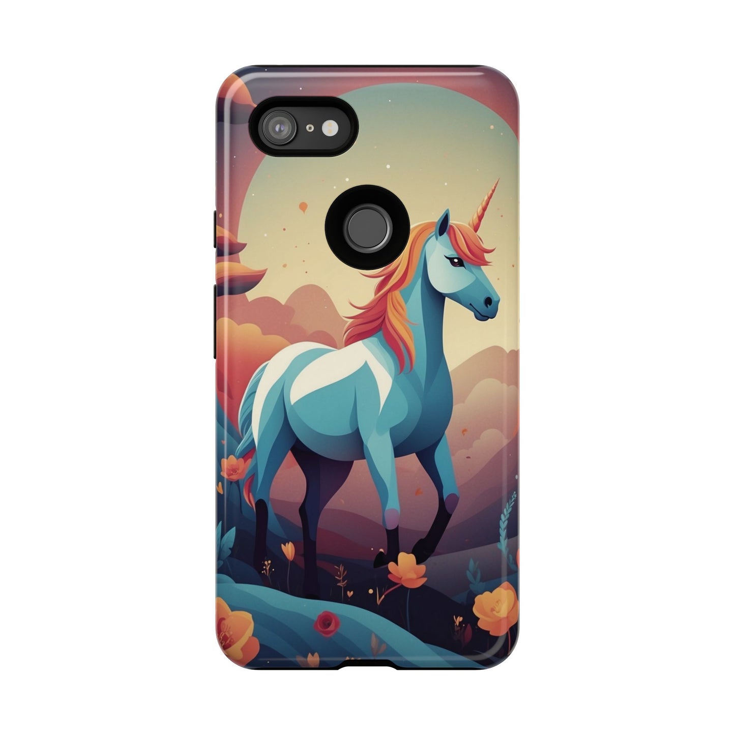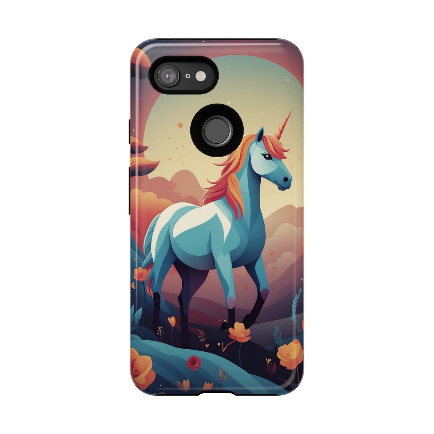 A stunning unicorn stands beneath a glowing moon, surrounded by rolling fantasy hills and golden flowers. This mobile phone case design blends modern flat illustration, gradient shading, and vibrant pop-surreal colours for a captivating, mystical look. Perfect for fantasy lovers and whimsical art collectors, it offers durable, everyday protection while transforming your device into a pocket-sized piece of art. Its bold blues, warm oranges, and clean shapes make it both striking and stylish for any magical adventure.
