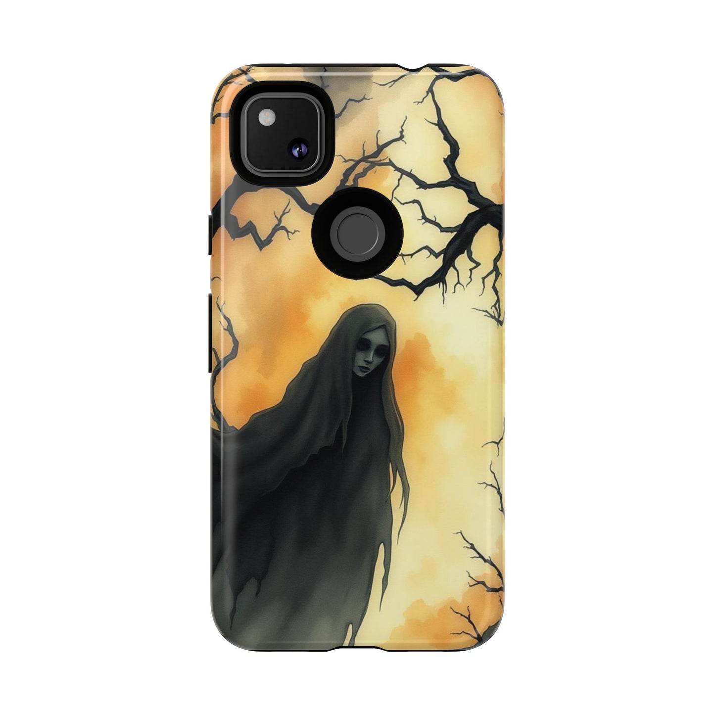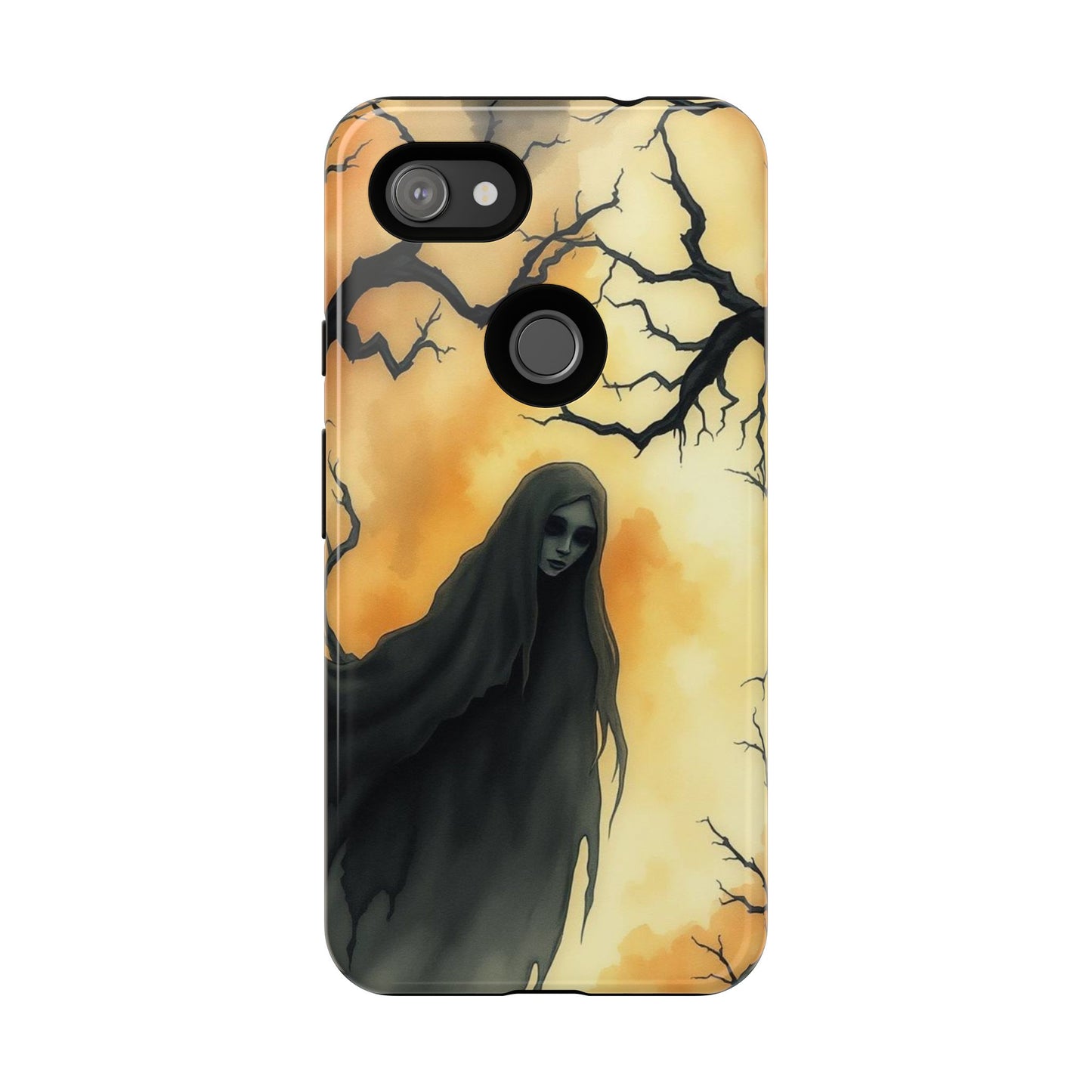 Immerse yourself in the haunting beauty of Where Shadows Smoulder. This phone case depicts a ghostly woman draped in flowing black rags, surrounded by crooked trees and a smoky wash of yellow and orange. Rendered in striking gothic watercolour, the design is both mysterious and poetic, capturing the quiet drama of shadow and light. Beyond its artistry, the hard, impact-resistant case offers perfect protection against drops and tears. Stylish protection, with a dash of whimsy - let your phone wear a story of darkness and fire.