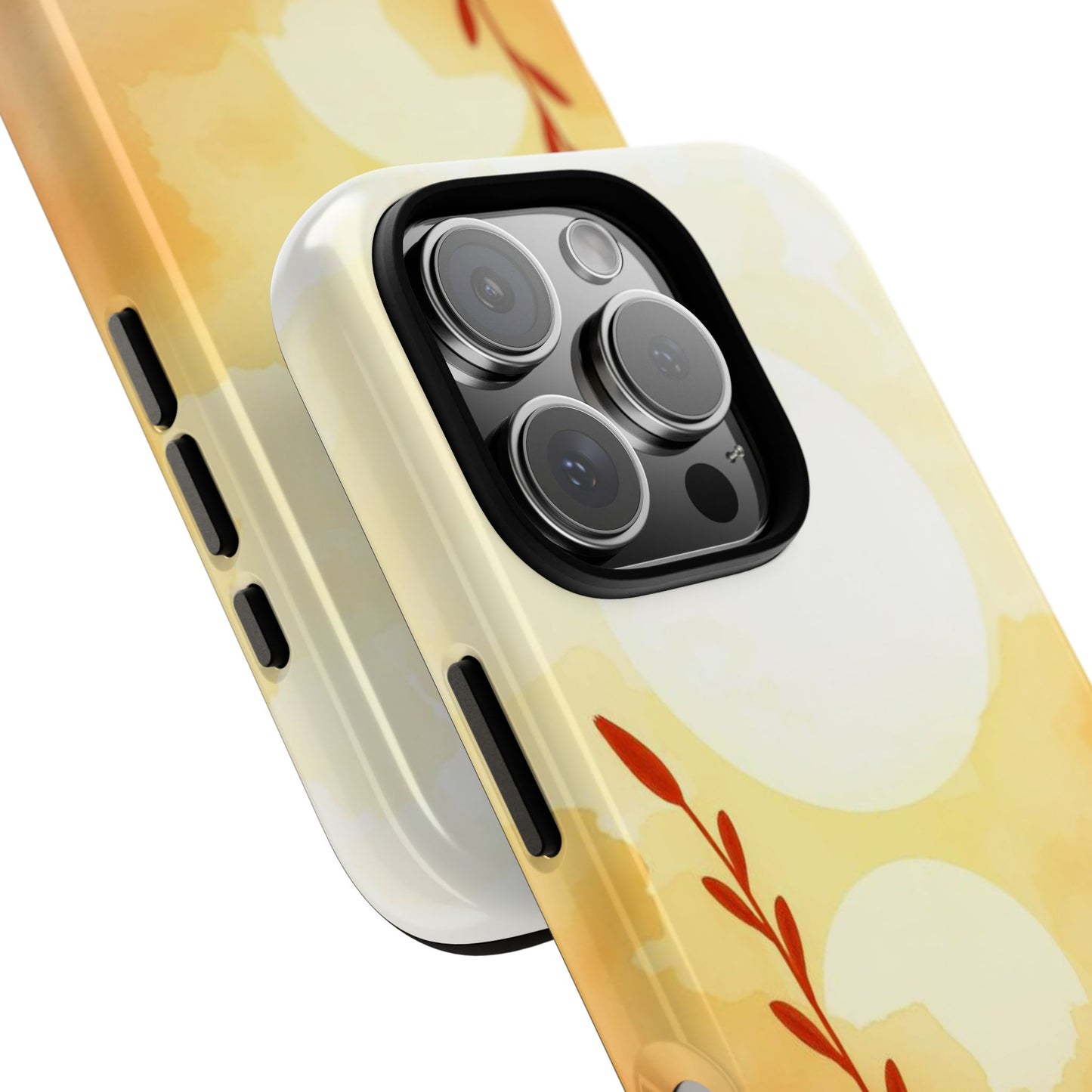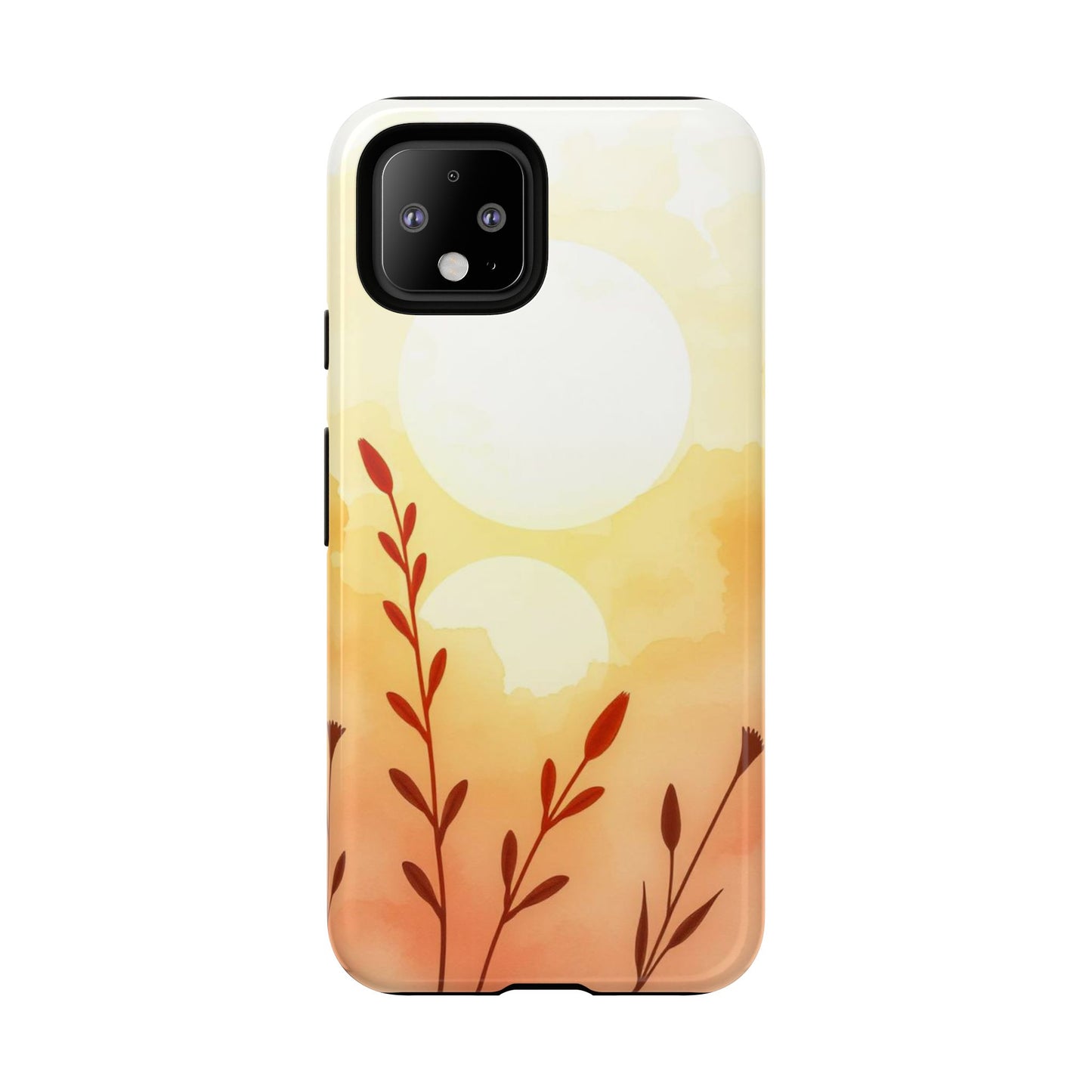 A tough, protective phone case showcasing a simple watercolor floral scene in glowing yellows and oranges. Graceful stems and leaves rise against a warm sunset wash, blending soft gradients for a serene, nature-inspired look. The minimalist design balances artistic elegance with durability, keeping your phone safe from drops and scratches while adding a touch of golden-hour charm.
